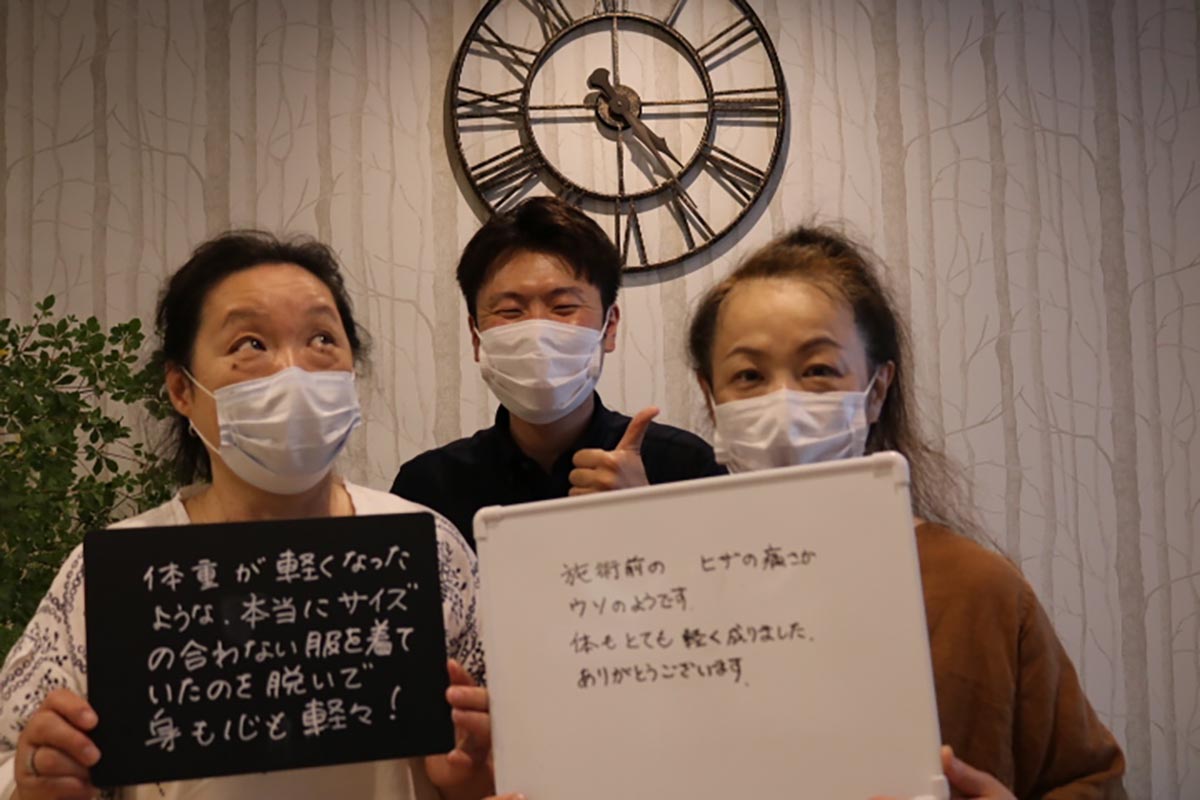 ・3~4年前から、就寝時に膝が重なるだけで痛みが出てしまい、夜もゆっくり休むことができませんでした。膝が痛くなる怪我などをしていたわけではないのですが、徐々に歩くだけでも痛みが出てしまい階段はゆっくり下りることしかできませんでした。しかし、1度の施術を受けただけで、「施術前の膝の痛みが嘘のようです。体もとても軽くなりました。ありがとうございます。 (姉妹で来院 K様 Y様 60代 女性 主婦) ※効果には個人差があります |