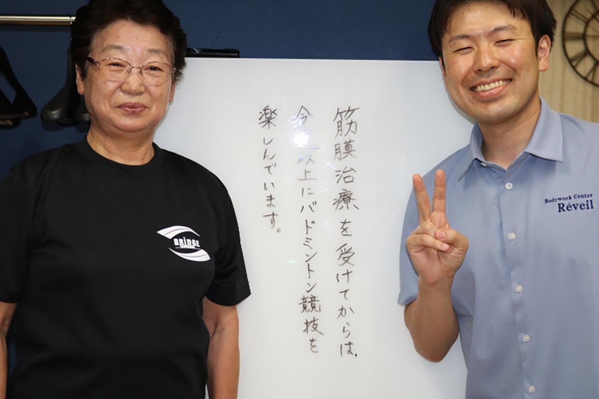 私はバドミントンを始めて40数年になります。ところが、7~8年前から膝が痛み出し、整形外科では溜まった水を抜き、ヒアルロン酸を打ってもらい、施術院では「はり・電気施術」にほぼ毎日通いましたが病状は一向に改善せず手術を勧められるほど悪化してしまいました。周囲の友人も私の異変に気づき、友人が通っていたこの整体院に連れて行ってもらいました。 現在、院長先生の施術を月1回のペースで通っており、骨盤のズレ・腰・肩・首とあらゆる部分の筋膜を全体的に施術して頂いており、週に2・3回通っていた「はり・電気施術」とは無縁になりました。そして、先生の施術により、体感的には10歳位若返った気持ちになっております。 膝も良くなり、現在は76歳ながら週に2回のバドミントンの練習にも参加できるようになりました。施術前の状況を知っている仲間からは、急激に症状が改善した原因に興味深々の様子であり、今では「筋膜リリース」を私が仲間たちにPRしています! 私も今年は77歳になります。残り少ないバドミントン人生を思いっきりエンジョイしたいと思っております。 現在、整体院には私の家族全員(夫・息子夫婦・娘・孫)でお世話になっており,快適な毎日を送っております。今後ともサポートをお願いしたいと思っております。 (S様. 札幌市 76歳 女性) ※効果には個人差があります |